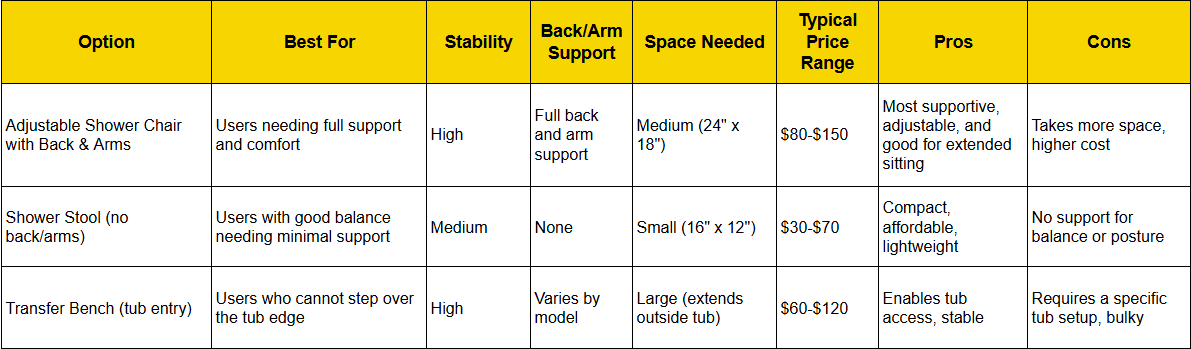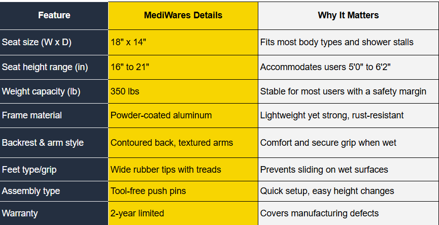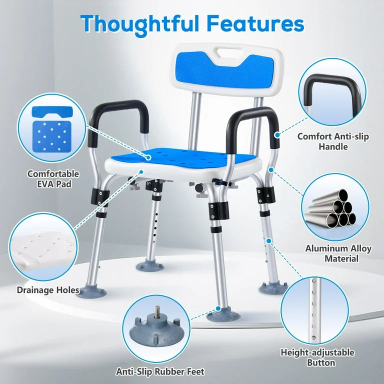 Caregivers also find these chairs valuable because they reduce the physical strain of assisting someone with bathing. The backrest provides postural support, while arms make it easier to help someone sit down or stand up safely.