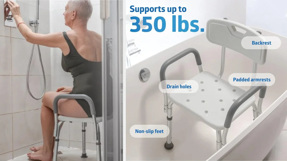 Shower chairs with backrests and arms help many people maintain independence and safety while bathing.